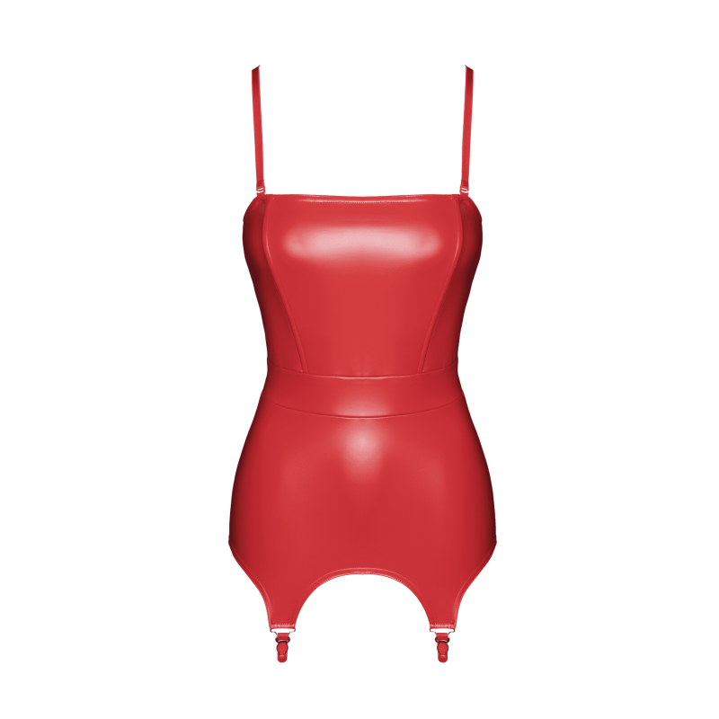 Corset and garter belt combination made of red powerwetlook fabric. Waist-accentuating fit with structured corset-style top with boning for structure and support. Fastened at the back with a zipper. Lower section functions as a garter belt with four straps and clips.