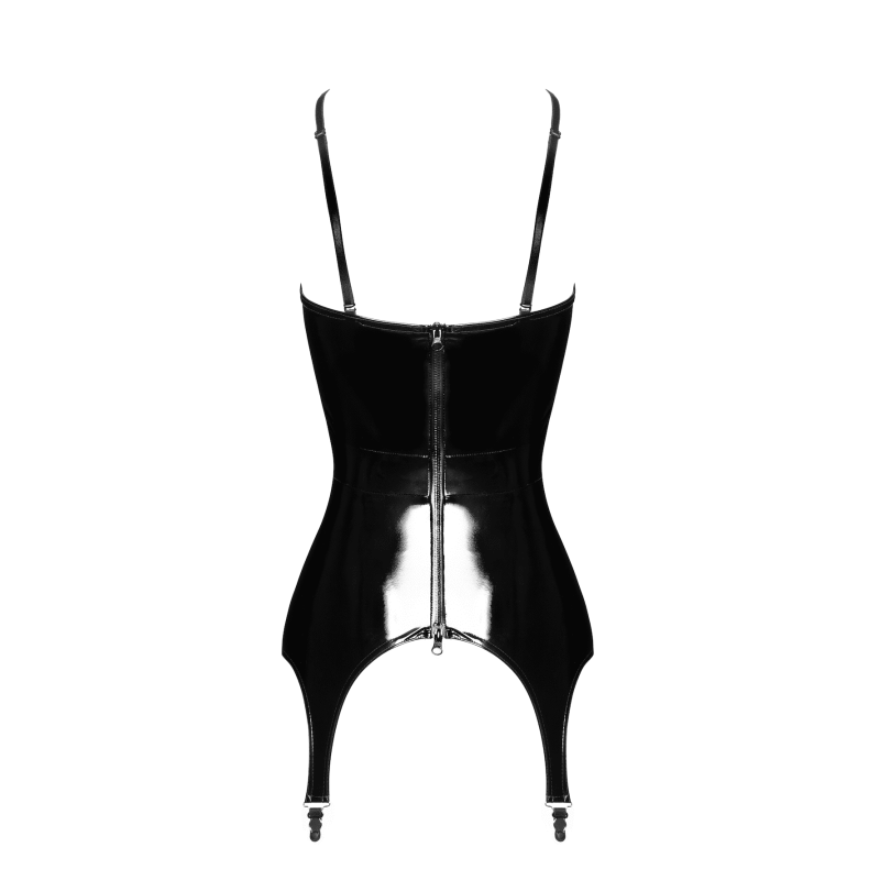 Corset and garter belt combination made of black shiny PVC. Waist-accentuating fit with corset-style top featuring boning for structure and support. Fastened at the back with a zipper. Lower section functions as a garter belt with four straps and clips.