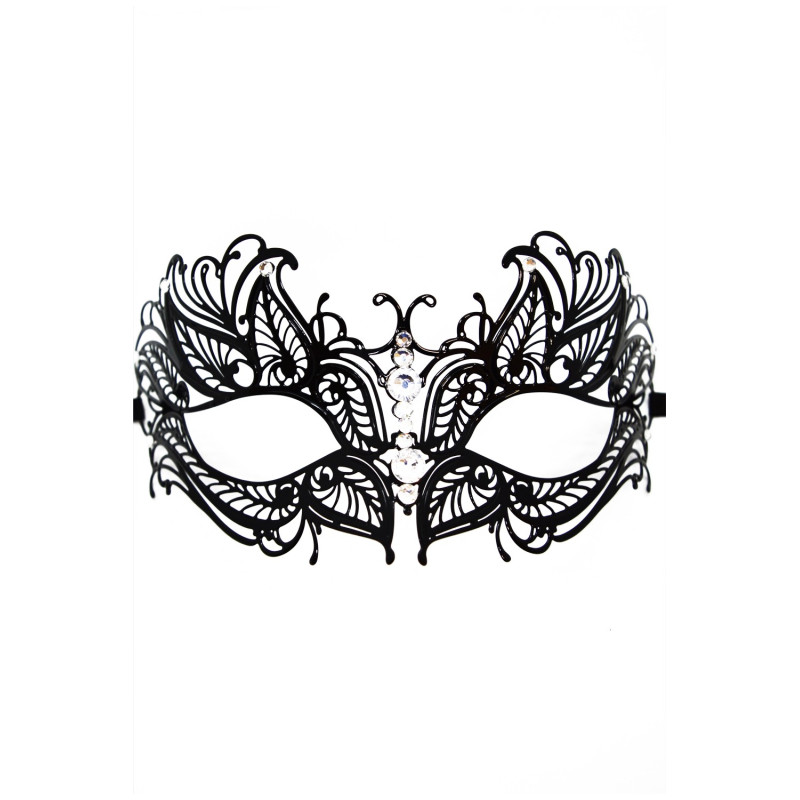 Masque vénitien Greta rigide noir avec strass. Attache par liens. Un masque vénitien haut de gamme pour vos soirées déguisées ou sensuelles