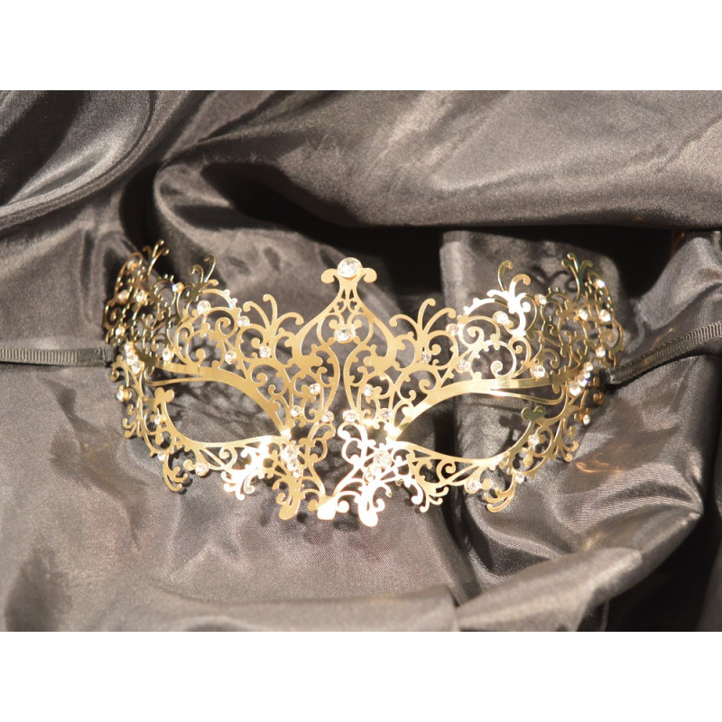 Masque vénitien Chiara rigide doré avec strass. Attache par liens.