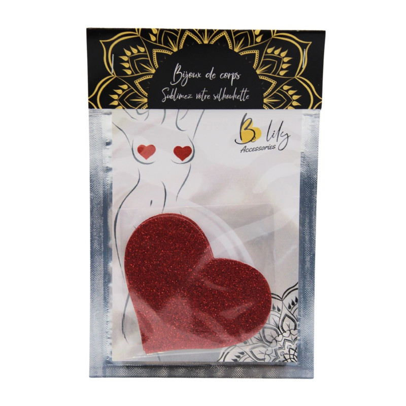 Cache mamelons forme de cœur pour tétons. Cœur rouge pailleté à coller pour sublimer votre poitrine.