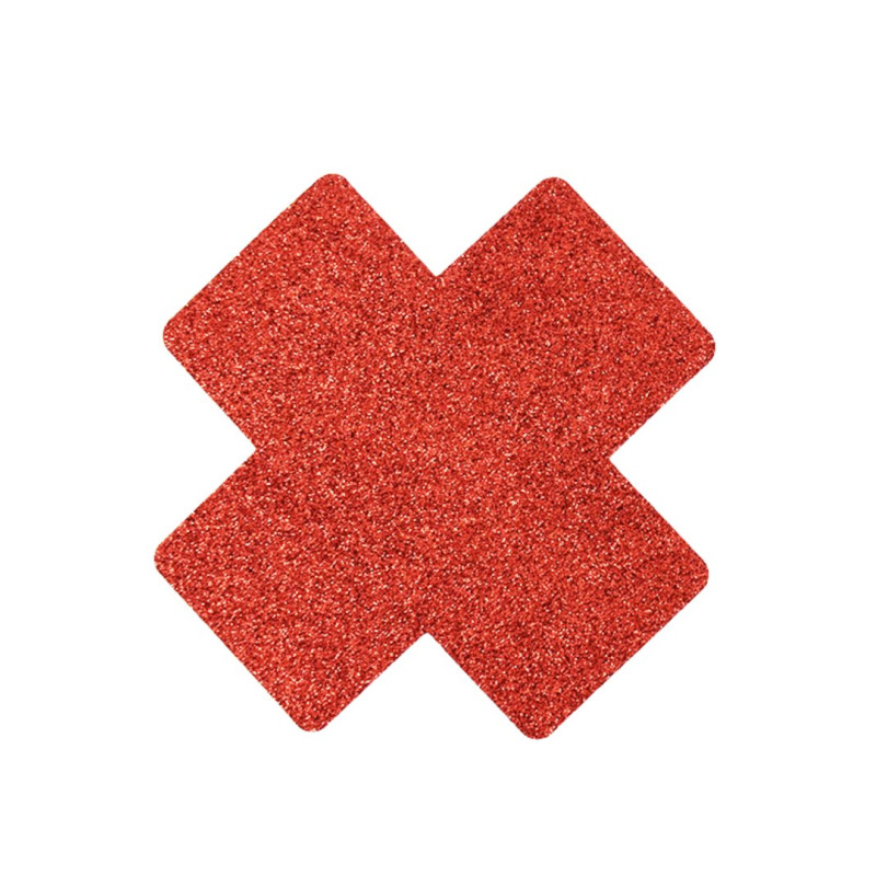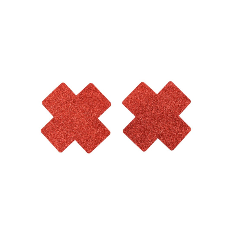 Cache mamelons forme de croix pour tétons. Croix rouge pailletée à coller pour sublimer votre poitrine.