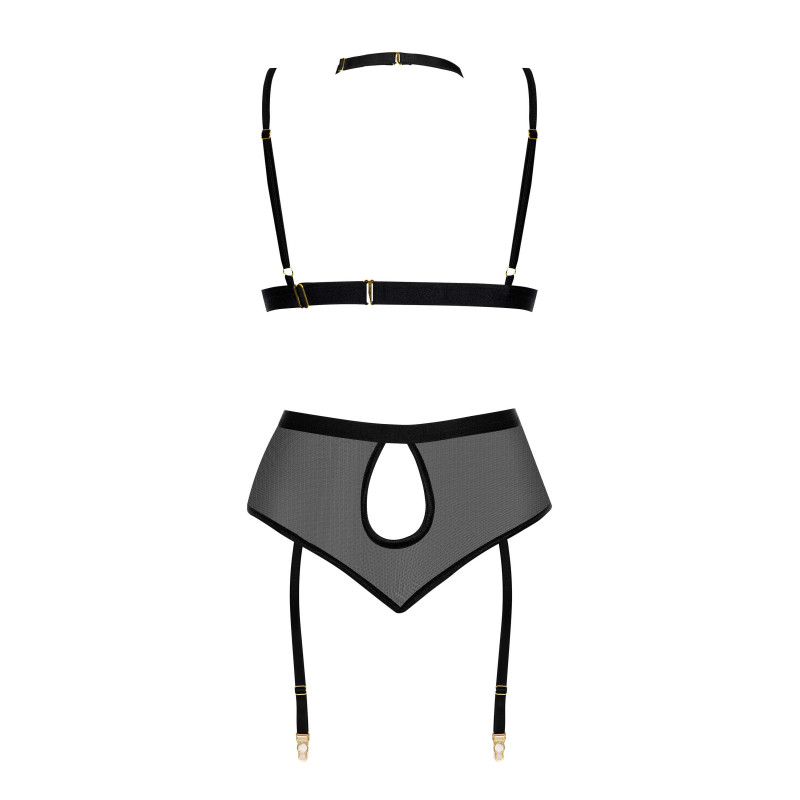 Cristalyn set black is a lingerie set that brings together refined elegance and daring charm. The lace embellishments and sheer mesh panels create a captivating look that enhances the female silhouette. The soft-cup bra gently embraces the bust, while the high-waist garter belt adds a touch of sophistication. The back, with its playful cut-out and semi-transparent finish, introduces an element of tempting mystery.