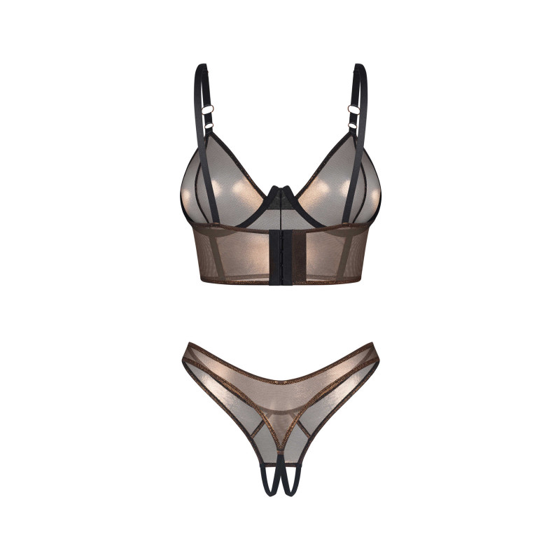 Two-piece set made of golden mesh with a sheer finish. The underwired top enhances the bust, while the open-crotch thong adds boldness and creates a provocative highlight of the set.