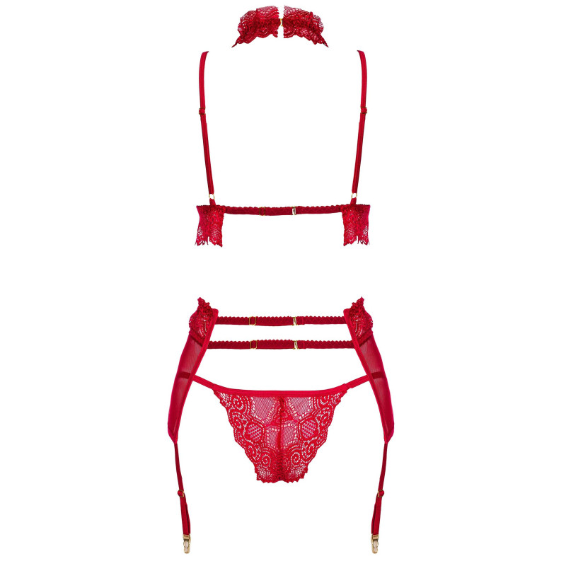 Velvet Sin set cherry combines bold design with elegance. Sheer lace subtly reveals the body, while the vibrant cherry red instantly draws attention. The bra enhances the neckline, the garter belt defines the waist, and lace thong panties add a daring finish. The look is completed with a sensual lace choker for maximum allure.