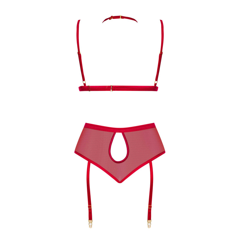 Cristalyn set cherry is designed for women who want to combine elegance with boldness. The vibrant red color highlights its sensual appeal, while delicate lace and sheer mesh add lightness and refinement. The soft bra cups embrace the bust naturally, while the high-waist garter belt shapes the waist and enhances the hips. The back, with its playful cut-out, adds a touch of seductive charm.