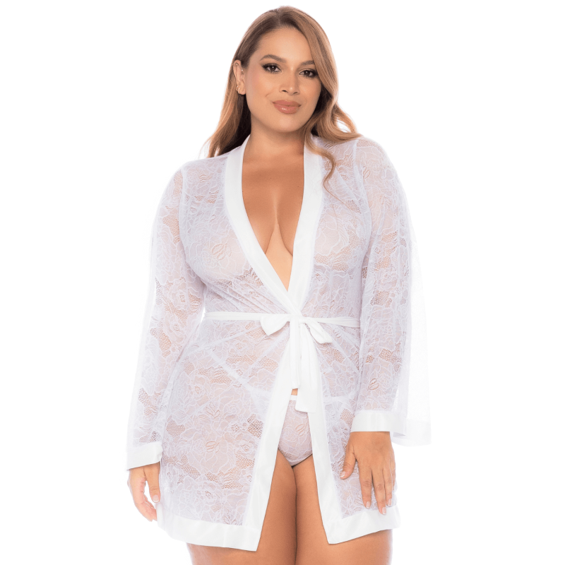 Ce somptueux peignoir en dentelle blanche est parfait pour ajouter une touche de sophistication à votre lingerie. Son tissu délicatement transparent, sa ceinture à nouer et ses manches longues fluides en font un incontournable pour un look raffiné et romantique.