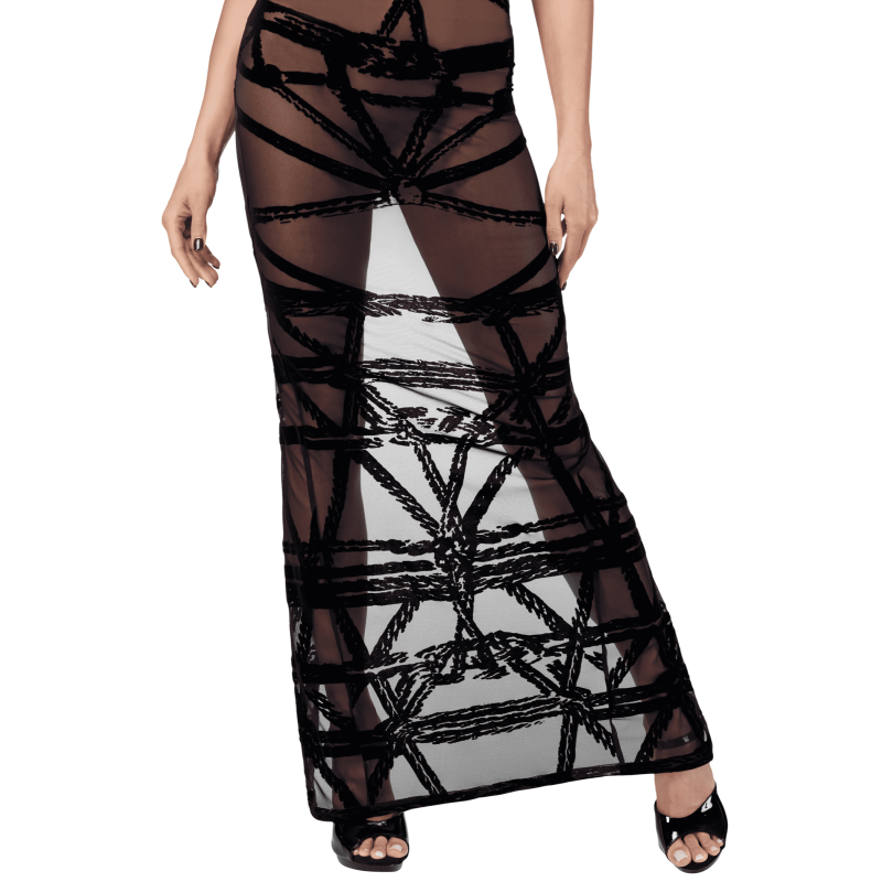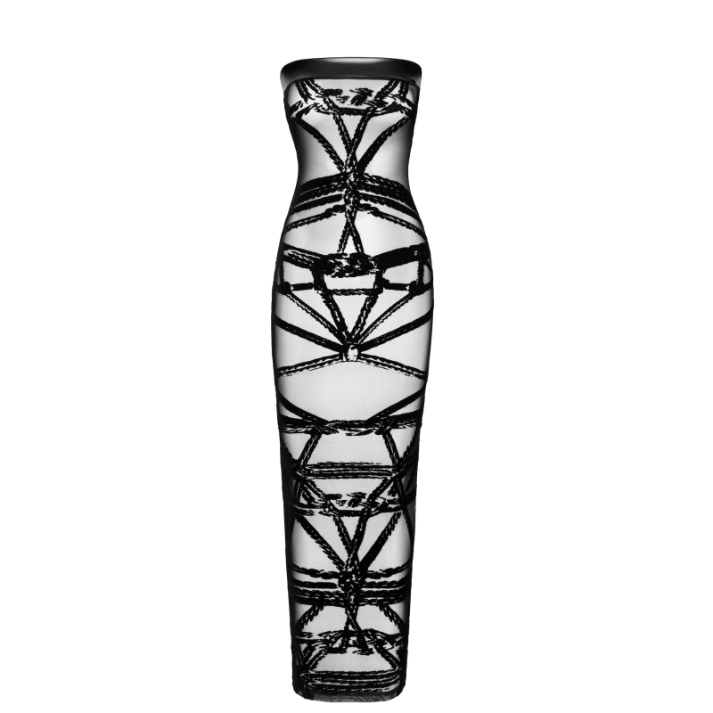 A long gown made of flocked tulle with a unique bondage pattern. The top is finished with a soft power wetlook band for comfort and fit. Features a deep slit at the back. Perfectly pairs with gloves in the same style.