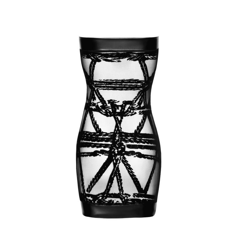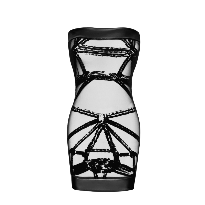 A mini dress made of flocked tulle with a unique bondage-style pattern. Finished at the top and bottom with soft power wetlook bands for stability and comfort.