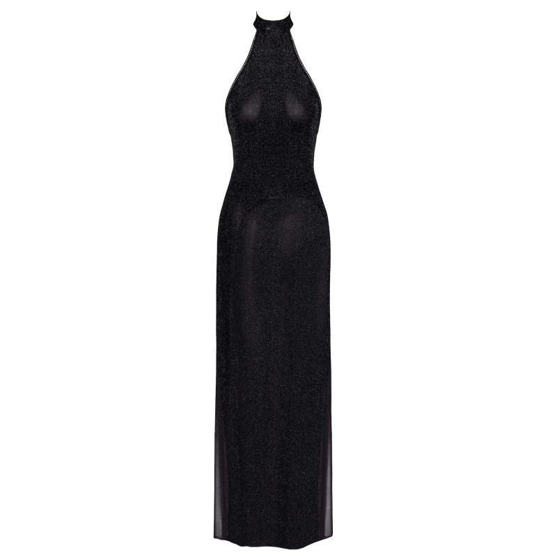 A long gown made of tulle with silver threads. It features a stand-up collar fastened with hooks, an open back adorned with a decorative rhinestone strap across the middle, and deep slits on both sides.