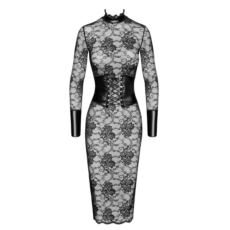 Black midi dress made of lace. Features a high decorative stand-up collar fastened with hook-and-eye closures, wide cuffs, and an integrated powerwetlook corset with lacing for adjustable fit. Back slit for ease of wearing. Finished with a decorative lace hem.