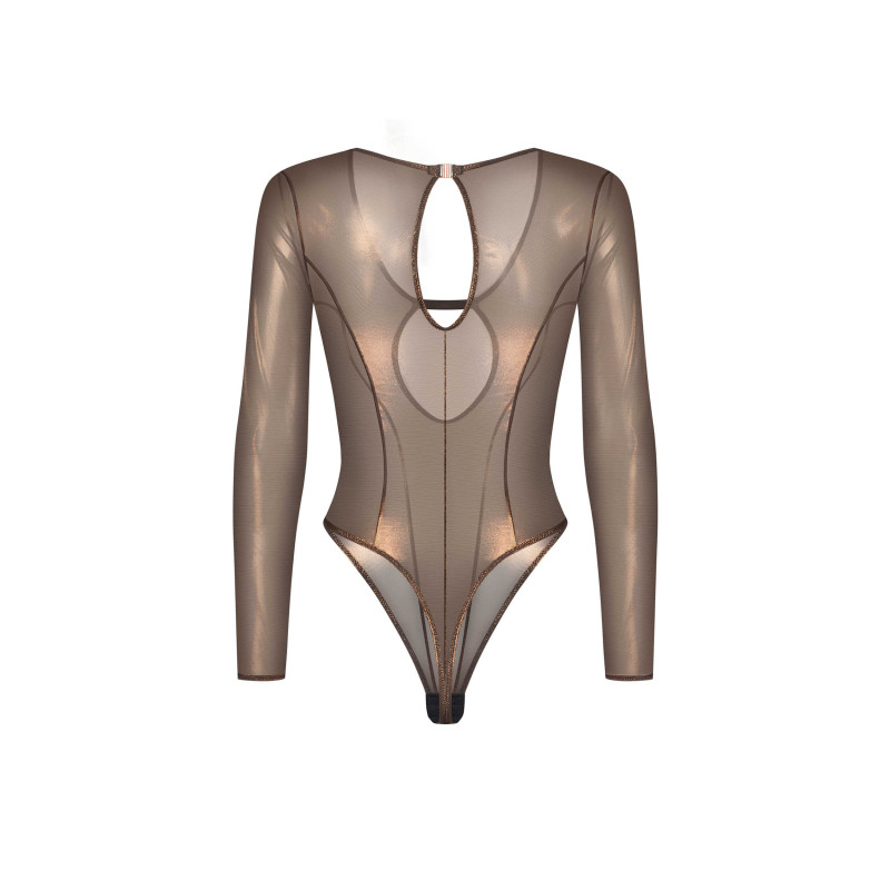 A bodysuit made from sheer mesh with a golden shimmer. The fitted design accentuates the curves, while the slightly transparent fabric adds a touch of subtle sensuality. Long sleeves lend an elegant, refined look.