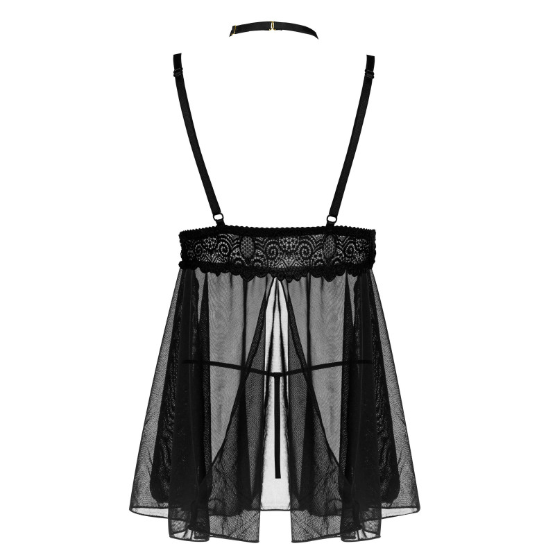 Milana babydoll black est une chemise de nuit unique qui combine l’élégance de la dentelle avec la légèreté de la maille transparente. Les bonnets moelleux et la bride décorative pour le cou rehaussent l’encolure, tandis que le bas en maille évasée ajoute une touche romantique. Le dos ouvert avec une culotte string incluse donne à l’ensemble un côté séduisant, ce qui en fait un choix parfait pour des nuits pleines de passion.