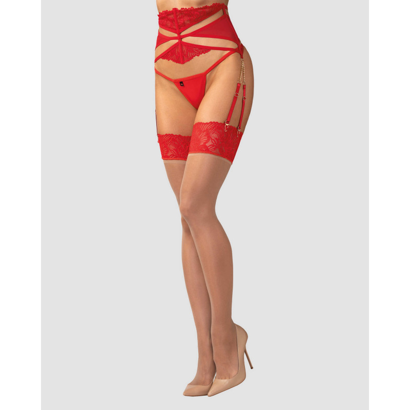 Bas nude avec de la dentelle rouge décorative aux cuisses. Fabriqué à partir d’un matériau doux et extensible qui épouse doucement le corps. La dentelle est assortie à d’autres pièces de la collection Matildea, ce qui rend ces bas sensuels pour un look sexy.