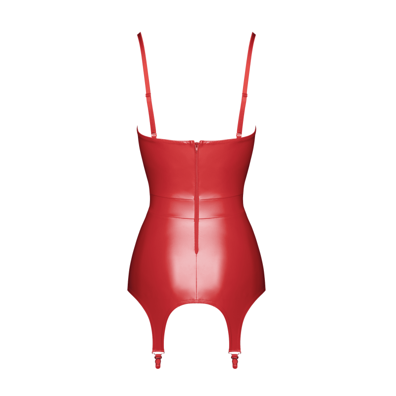 Combinaison de corset et de porte-jarretelles en tissu powerwetlook rouge. Coupe accentuant la taille avec un haut structuré de style corset avec baleines pour la structure et le soutien. Fermé à l’arrière avec une fermeture éclair. La section inférieure fonctionne comme un porte-jarretelles avec quatre sangles et clips.