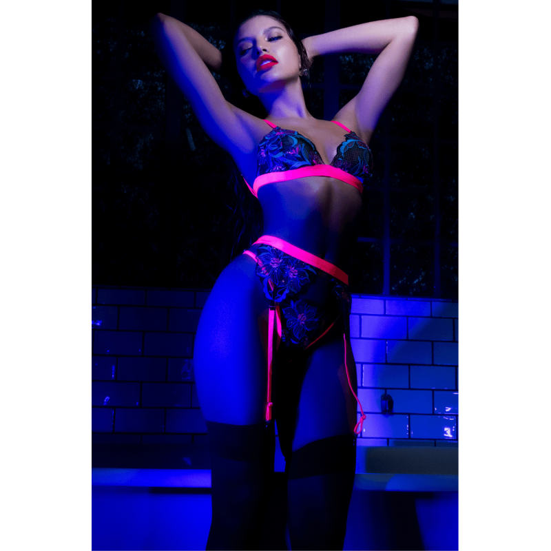 Ajoutez une pièce lumineuse et sophistiquée à votre catalogue avec cet ensemble de lingerie 3 pièces bleu et rose signé Mapalé. Ce modèle se distingue par sa broderie délicate rehaussée de sequins, apportant une touche éclatante et élégante.