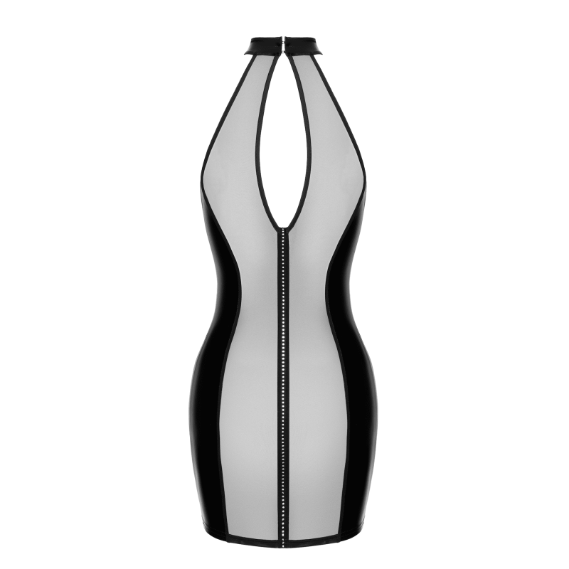Une mini-robe en power wetlook et tulle, décorée d’un ruban de strass passant au centre à l’avant et à l’arrière. Un design audacieux sans manches avec un col montant fermé par des crochets.