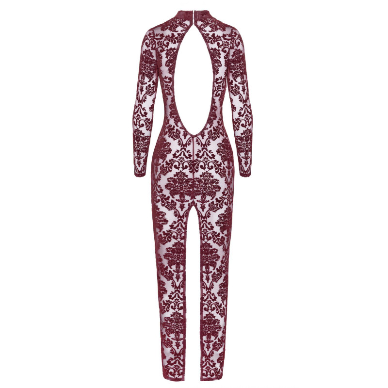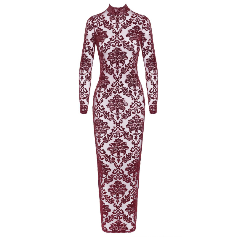 Robe longue en nouveau tissu noir — tulle floqué bordeaux. Dotée de manches longues, d’un motif élégant et d’un dos ouvert. Col montant fermé avec des fermetures à crochets et œillets. La fente arrière ajoute une touche séduisante.