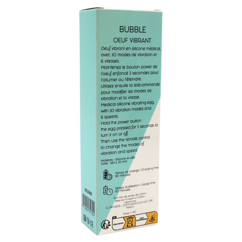 Le BUBBLE est un œuf vibrant nouvelle génération, conçu pour stimuler en douceur ou intensément selon vos envies. Grâce à ses 10 modes de vibration et ses 6 vitesses réglables, il offre un large éventail de sensations pour un plaisir entièrement personnalisable.