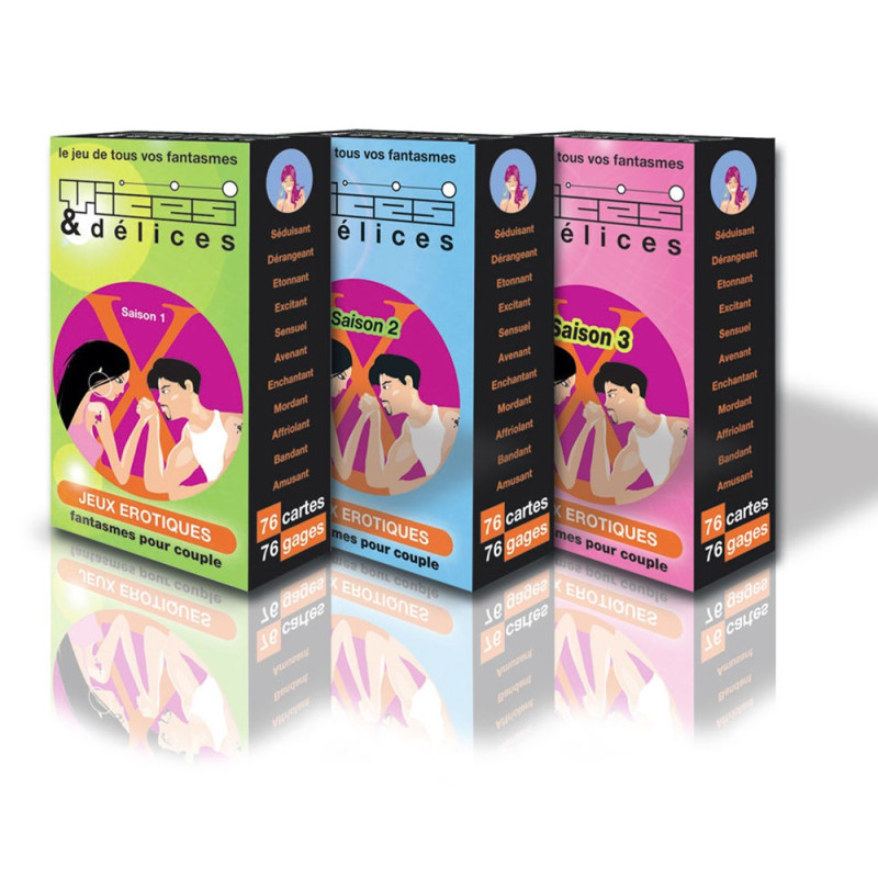 Jeu de cartes Vices et Délices Saison 1 - Jeu coquin alliant désir et fantasme. Jeu de cartes Vices et Délices Saison 1 - Jeu coquin alliant désir et fantasme. Pimentez votre relation et osez satisfaire vos envies les plus profondes avec Les Jeux Vices et Délices...un jeu érotique de cartes qui vous propose 76 gages pour éveiller vos désirs les plus secrets et vous met au défi de les réaliser. 3 niveaux de difficulté...Facile cartes de couleur verte ...Entreprenant cartes bleu ...Torride et libertin cartes orange. Pas de perdants !