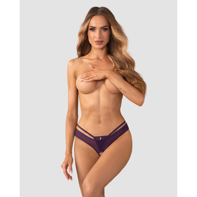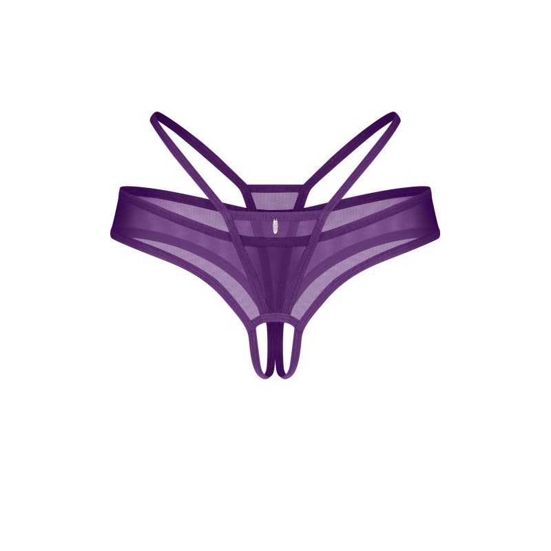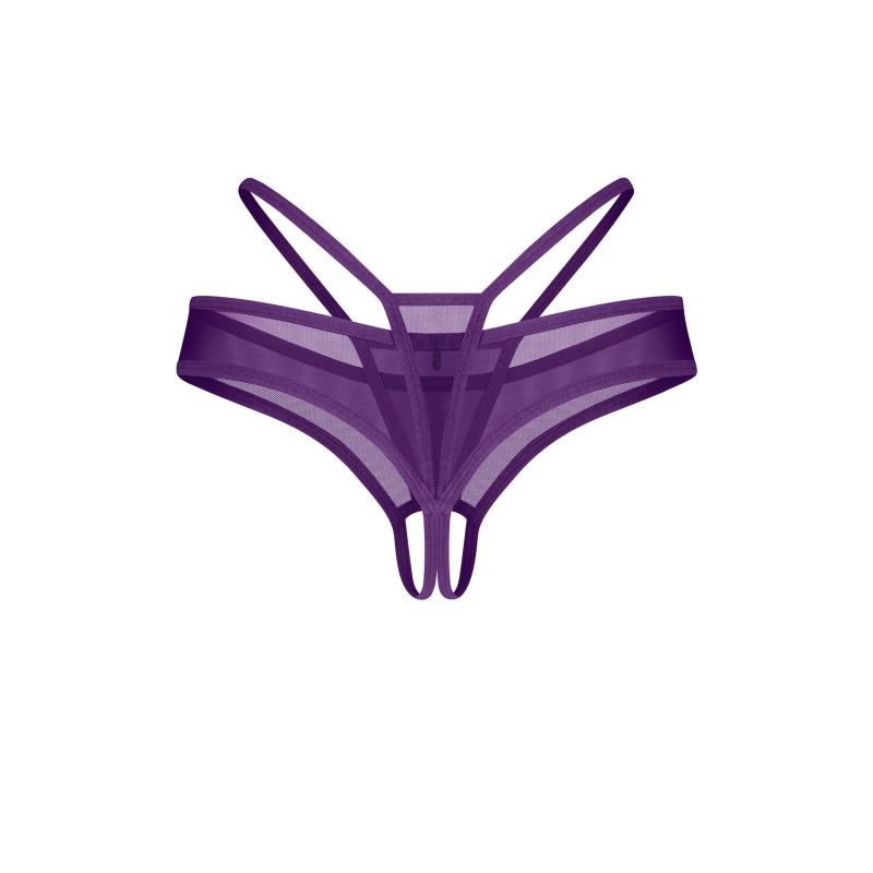 String violet ouvert en maille transparente dans une teinte audacieuse et vibrante. Le design à lanières accentue les hanches et l’arrière, tandis qu’un charme argenté à l’avant ajoute un détail subtil mais frappant.