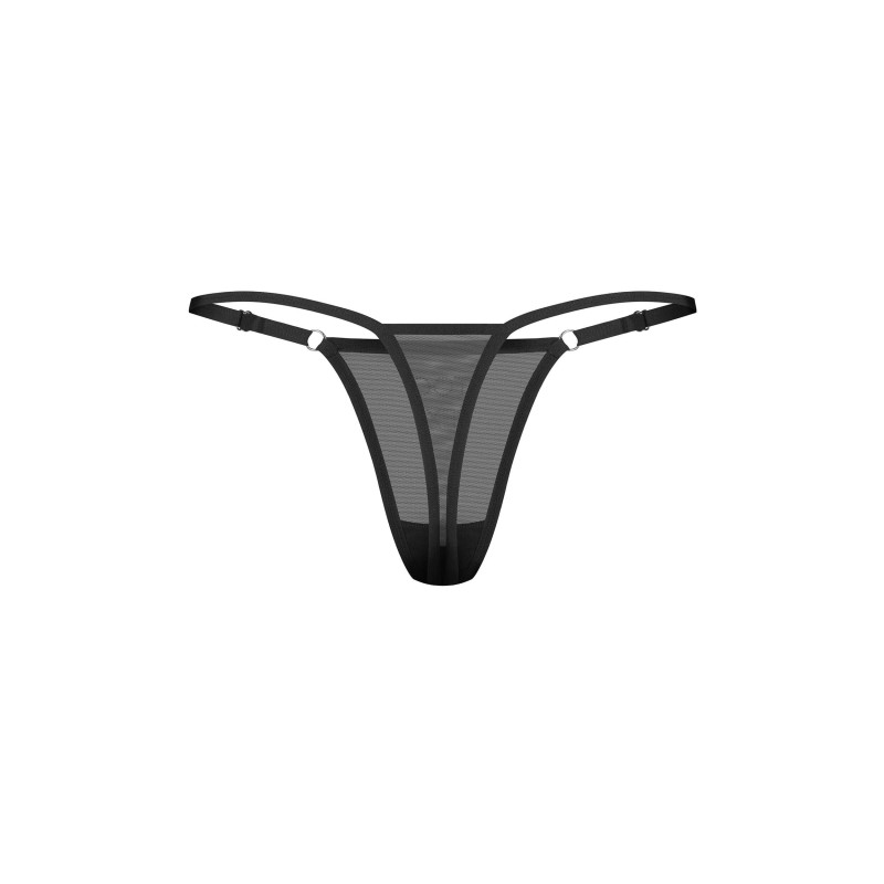 String en mesh noir orné d’une inscription « Sexy » en strass. Les sangles latérales réglables permettent un ajustement parfait au corps.
